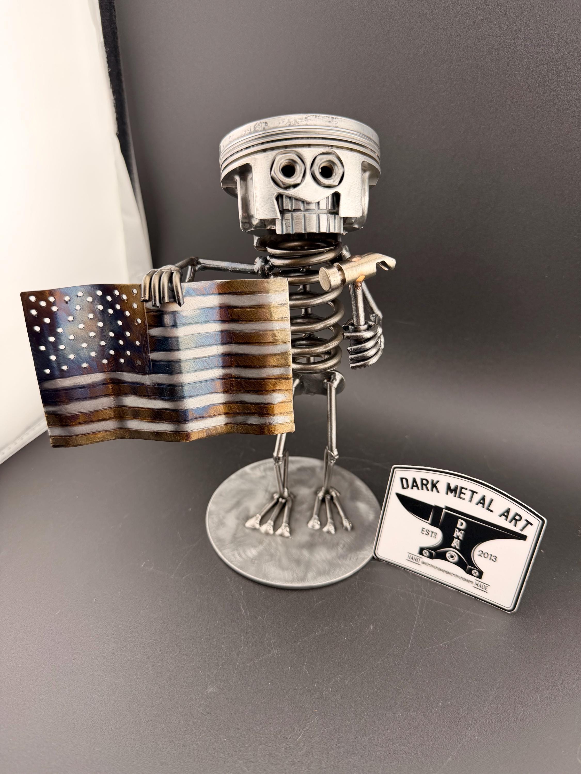This “Made in America” build is for the proud, hard working American. This build stands at approximately 7-8 inches tall. This build is made from car and motorcycle parts. Each build is made to order so they will vary slightly. Please allow 1-2 weeks for lead time (allow more time near holidays). This will definitely be a cherished piece of art by the hard worker you know.