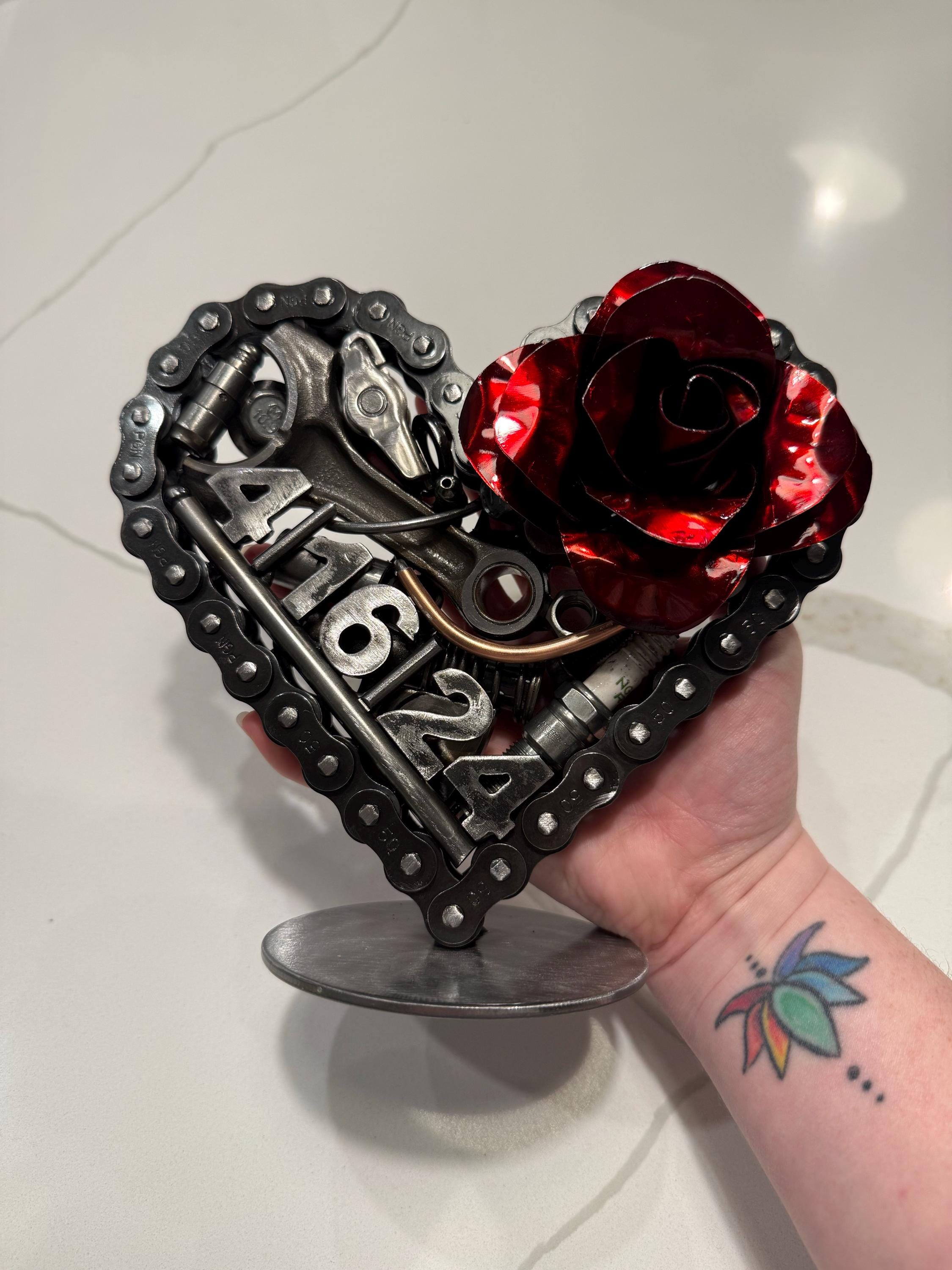 This sculpture is built from up-cycled metal and has a kick of color from a hand shaped Eternity Rose. Show that special someone how much they mean to you with this one of a kind build. No two builds are the same! These builds will come with a Red Rose unless another color is requested. I can build them with red, purple, electric blue, electric green, teal, electric yellow, champagne bronze, natural steel (silver) or blued steel (purple, blue, silver and gold hues). This build is 7 inches tall and 7.5 inches wide.