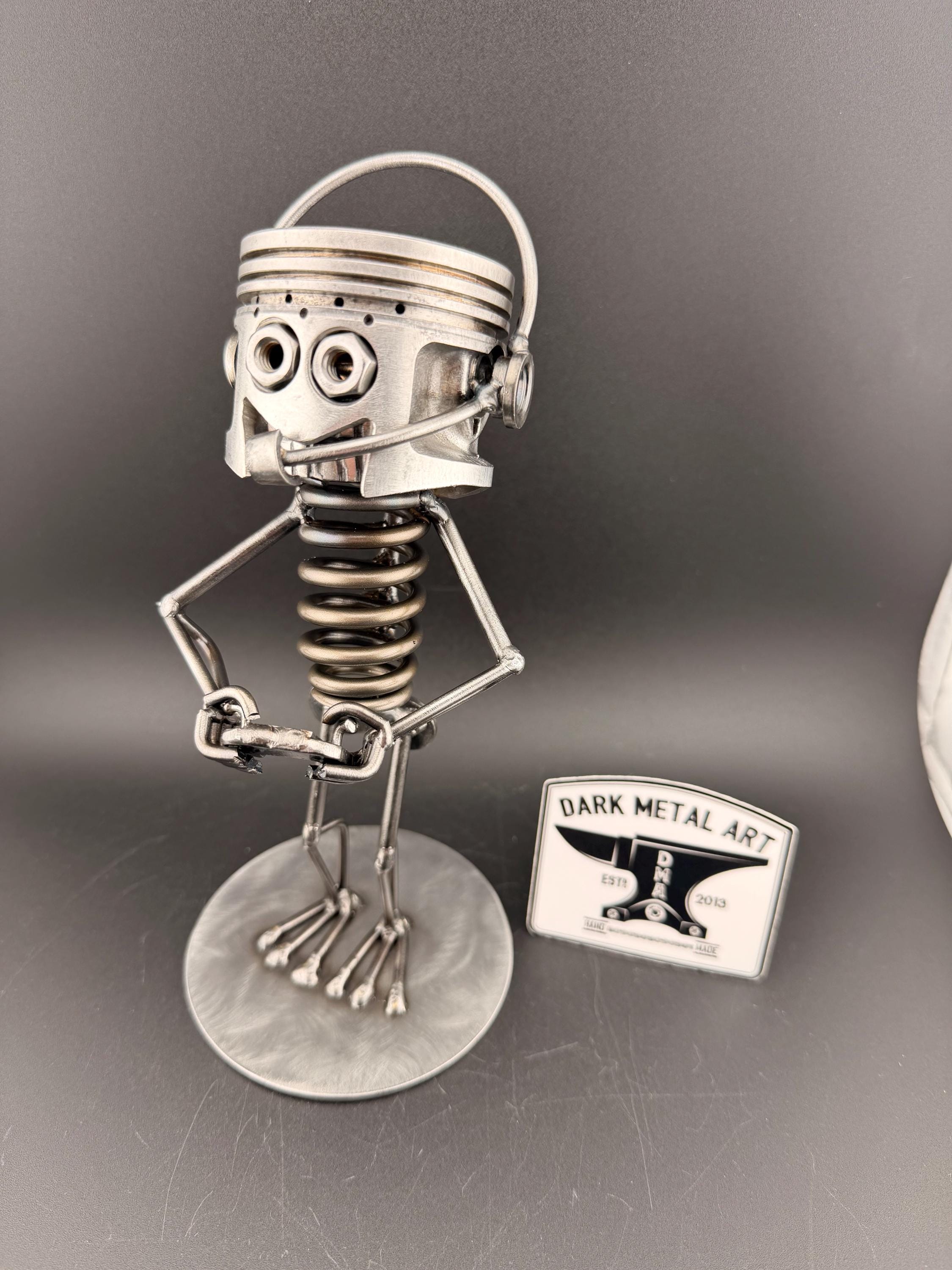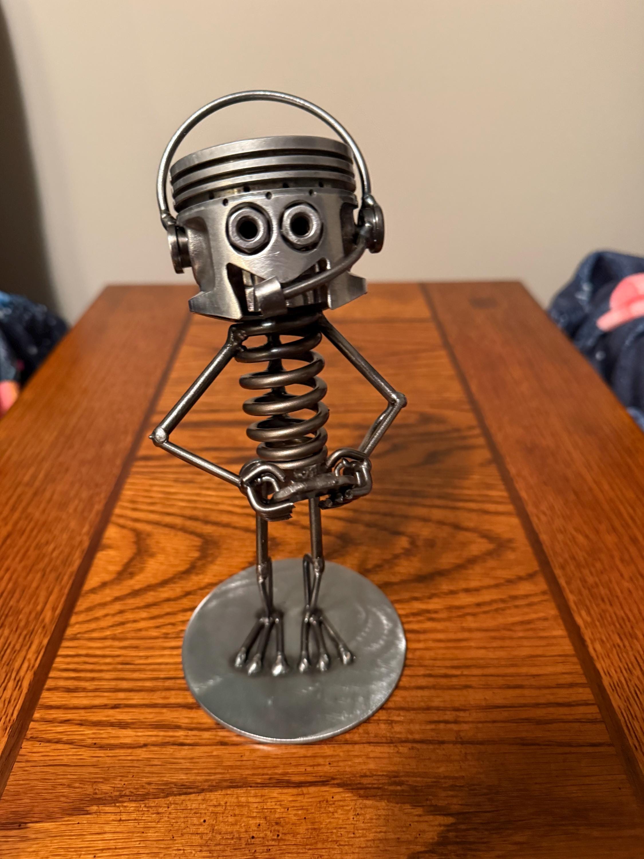 This Gamer is built from car and motorcycle parts. This build features a controller with joysticks and gamer headset. This build stands at approximately 7-8 inches tall. Each build is made to order so they will vary slightly. This unique build will be a conversation starter!