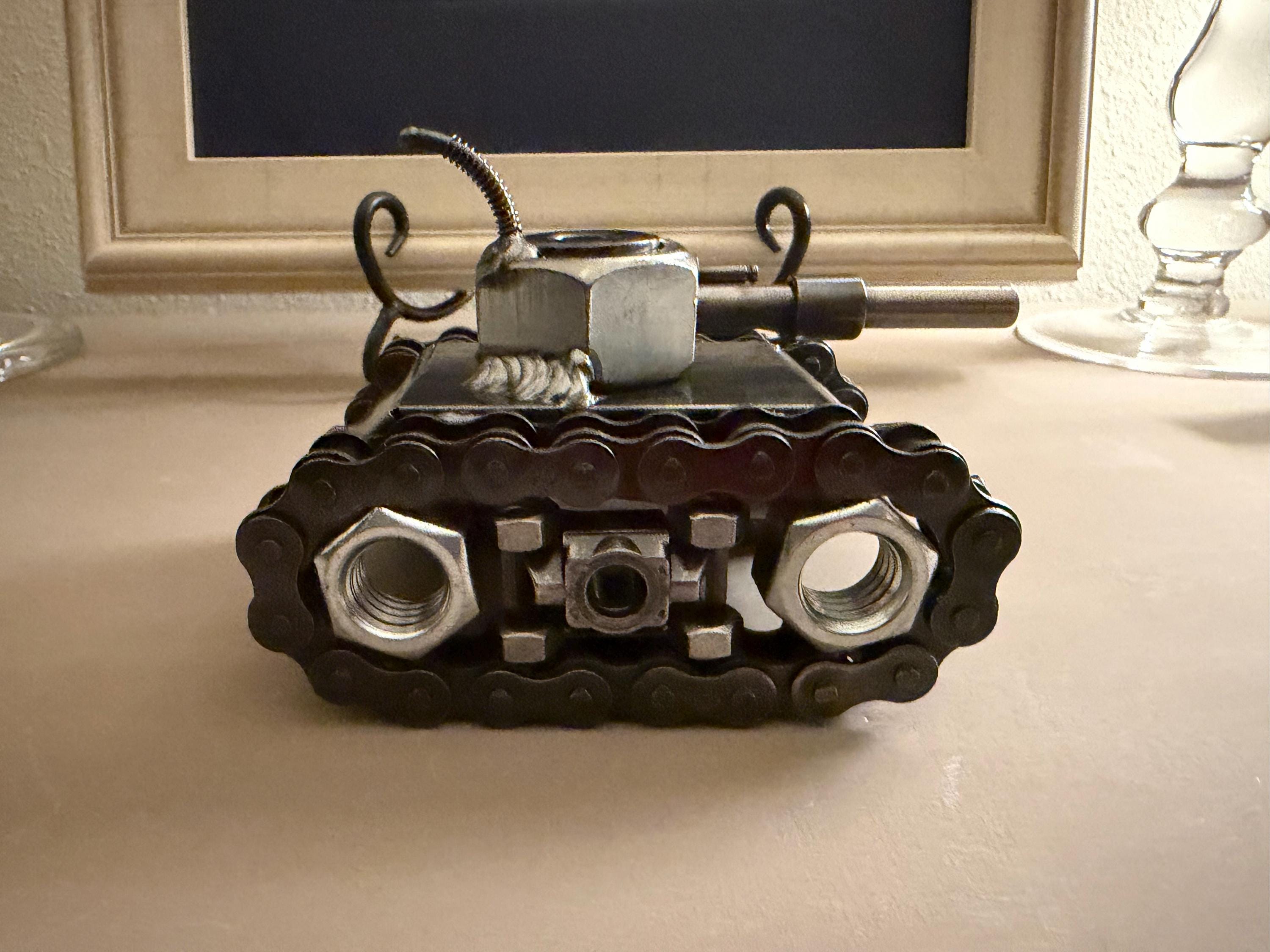 What better way to protect the items on your desk at work than with a miniature army tank! This tank is made from scrap metal and packs a big punch! All tanks are made to order.