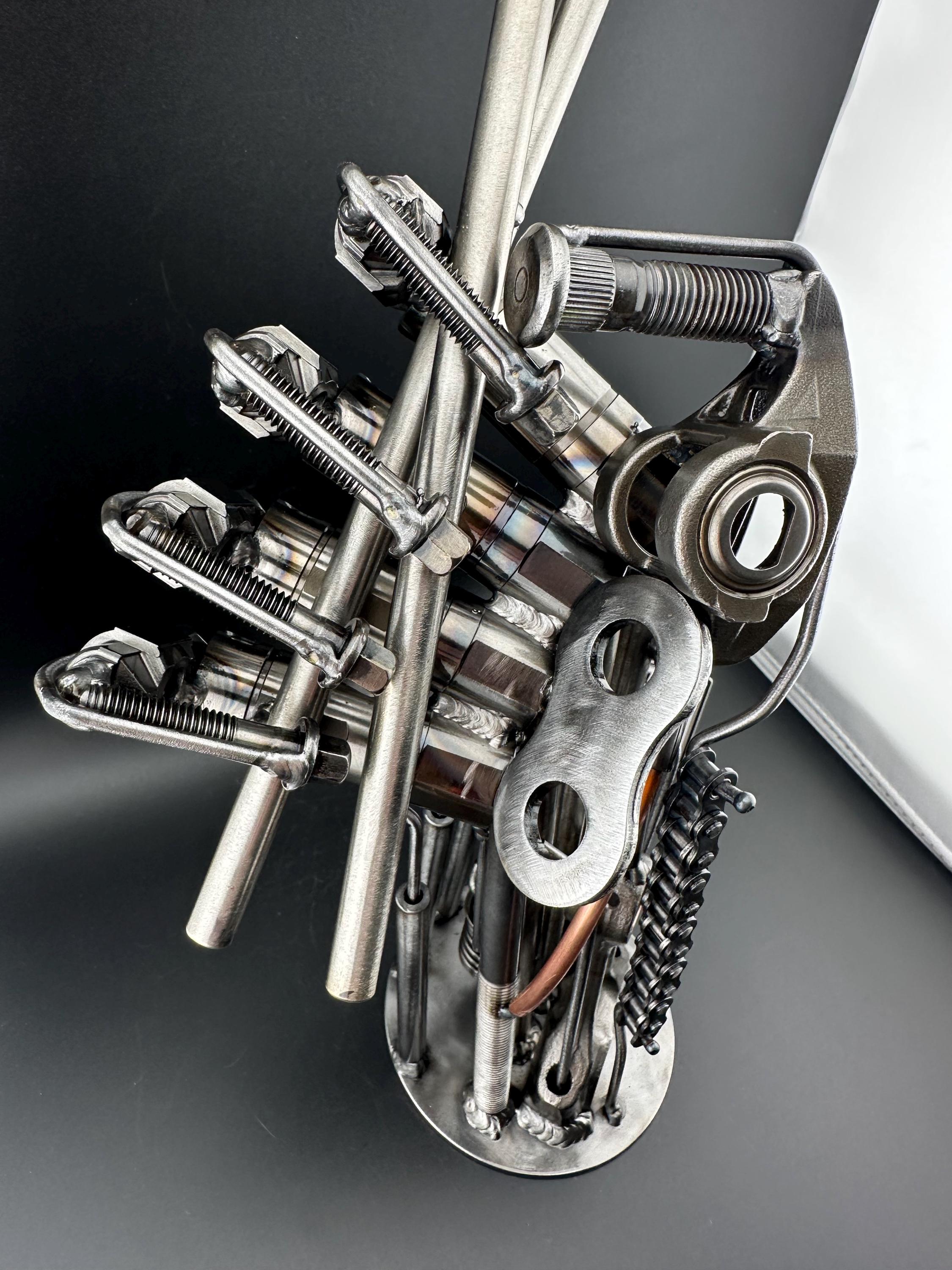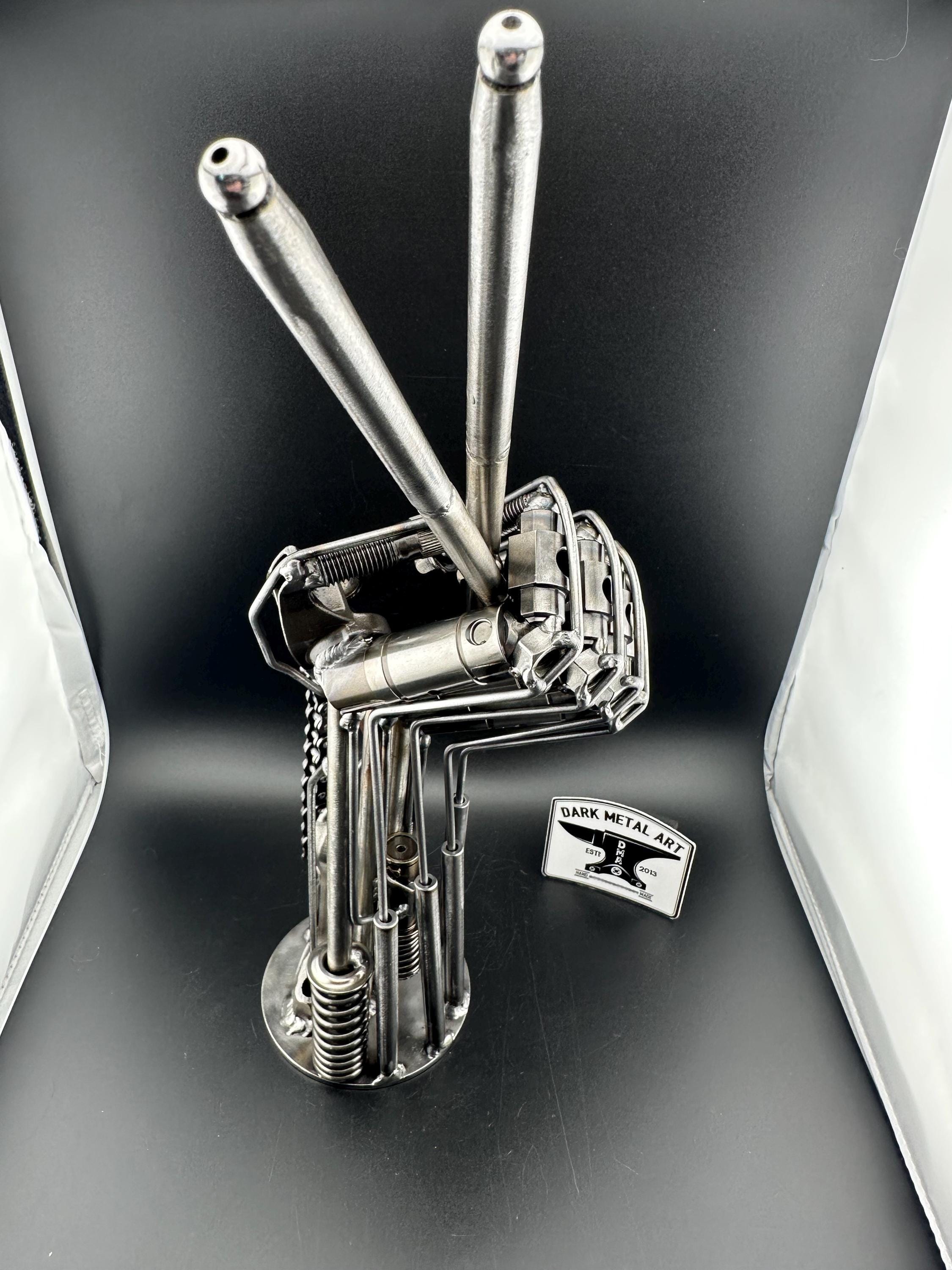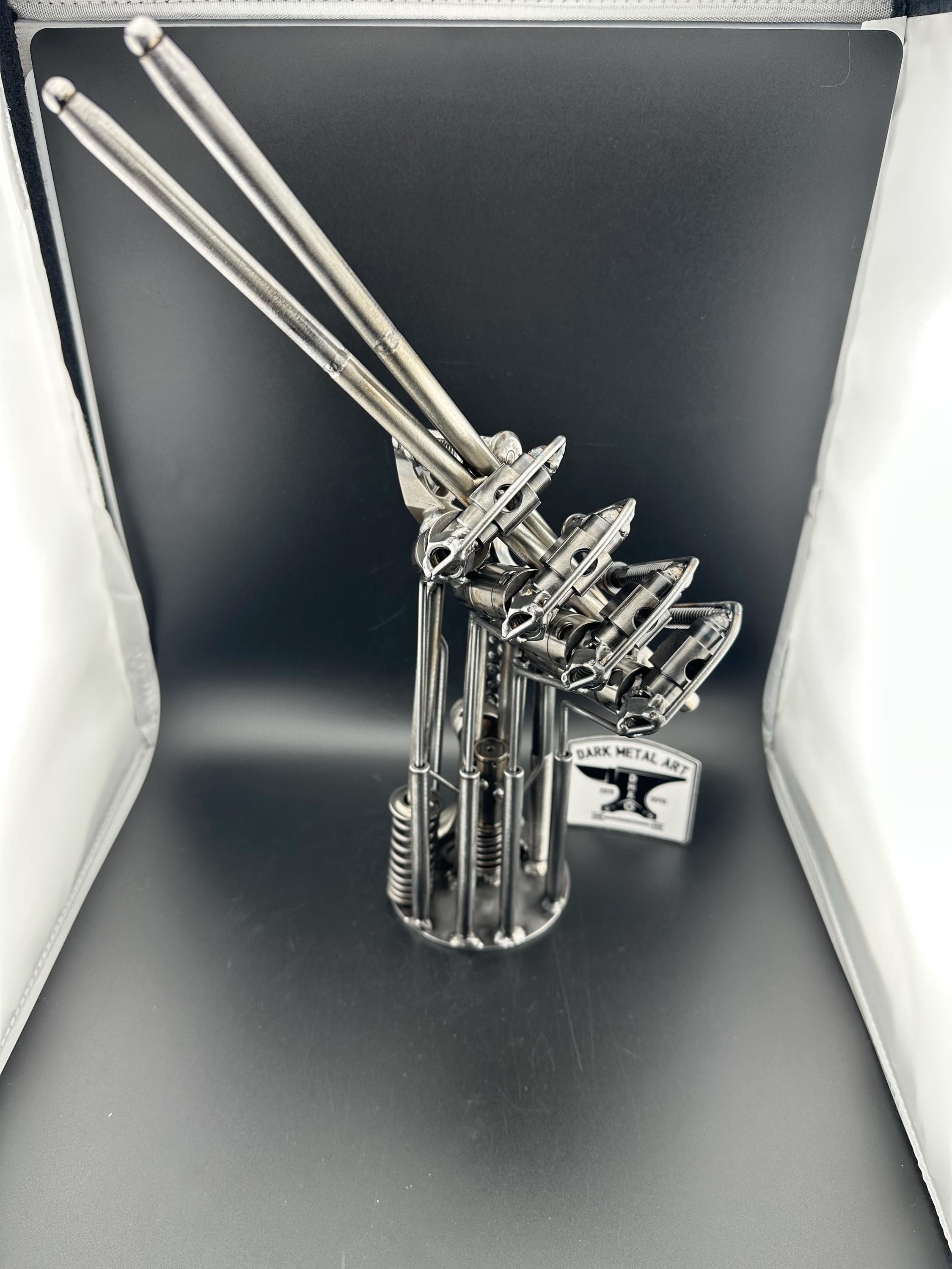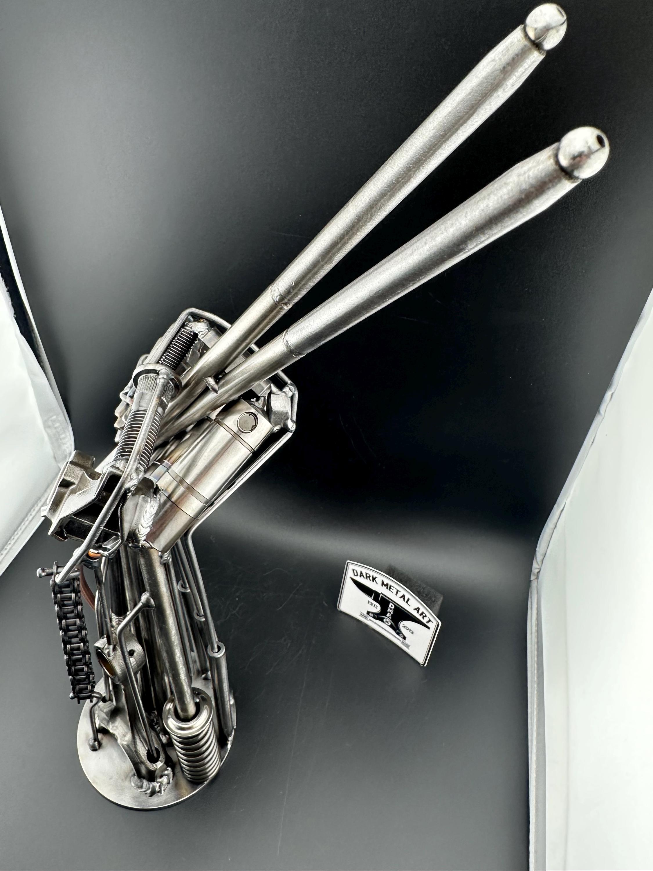 This build uses up-cycled parts from cars and motorcycles. This build is the perfect gift for the drummer you know. Each build is made to order and will vary slightly. Because they’re all built to order the lead time is typically 2 weeks but could be longer depending on what orders I have ahead of yours (I do keep my estimated ship time updated to reflect order volume). If you’re in a rush, please let me know. This build is usually 14-15 inches tall, that can vary because they’re all made to order.