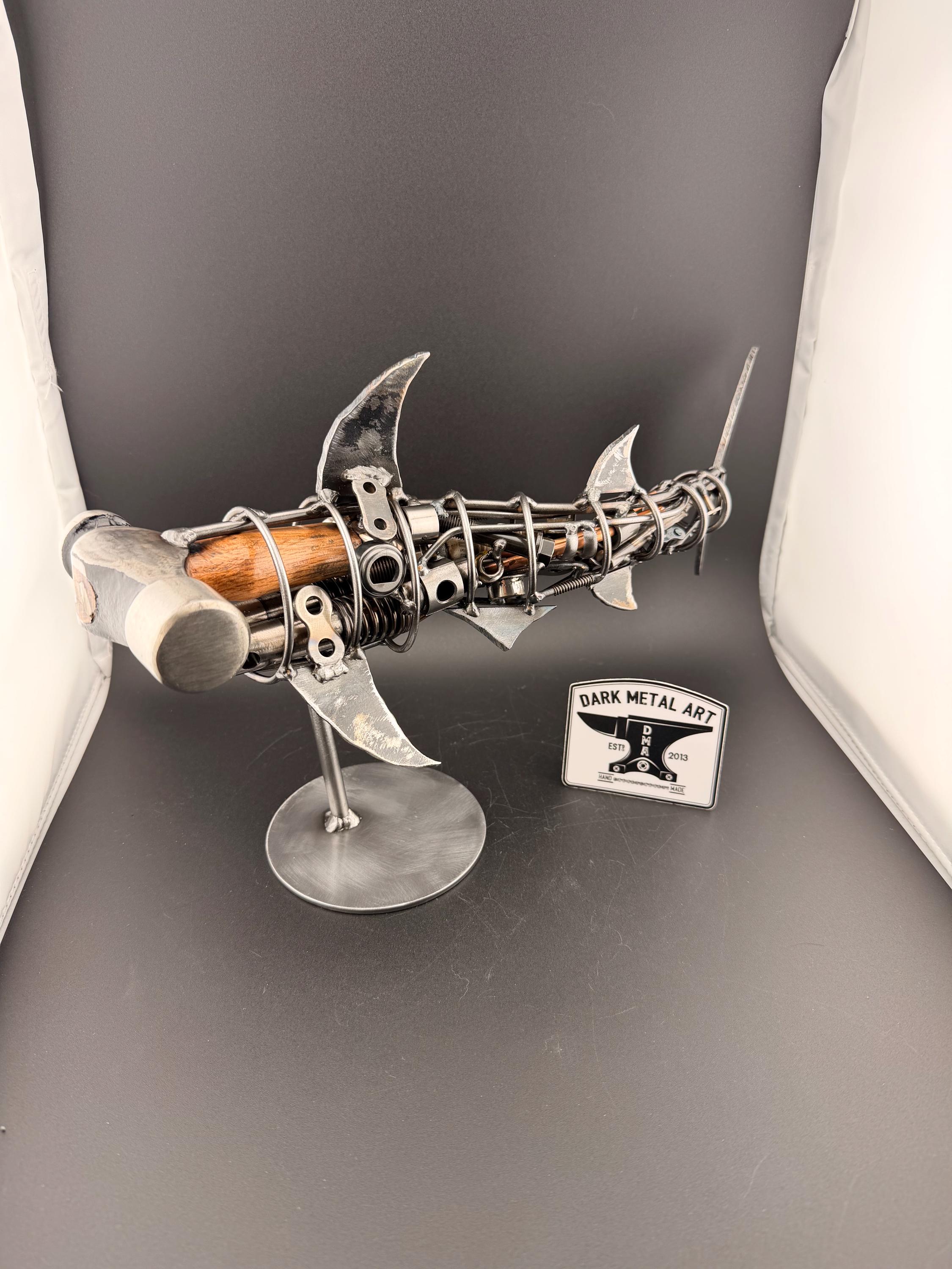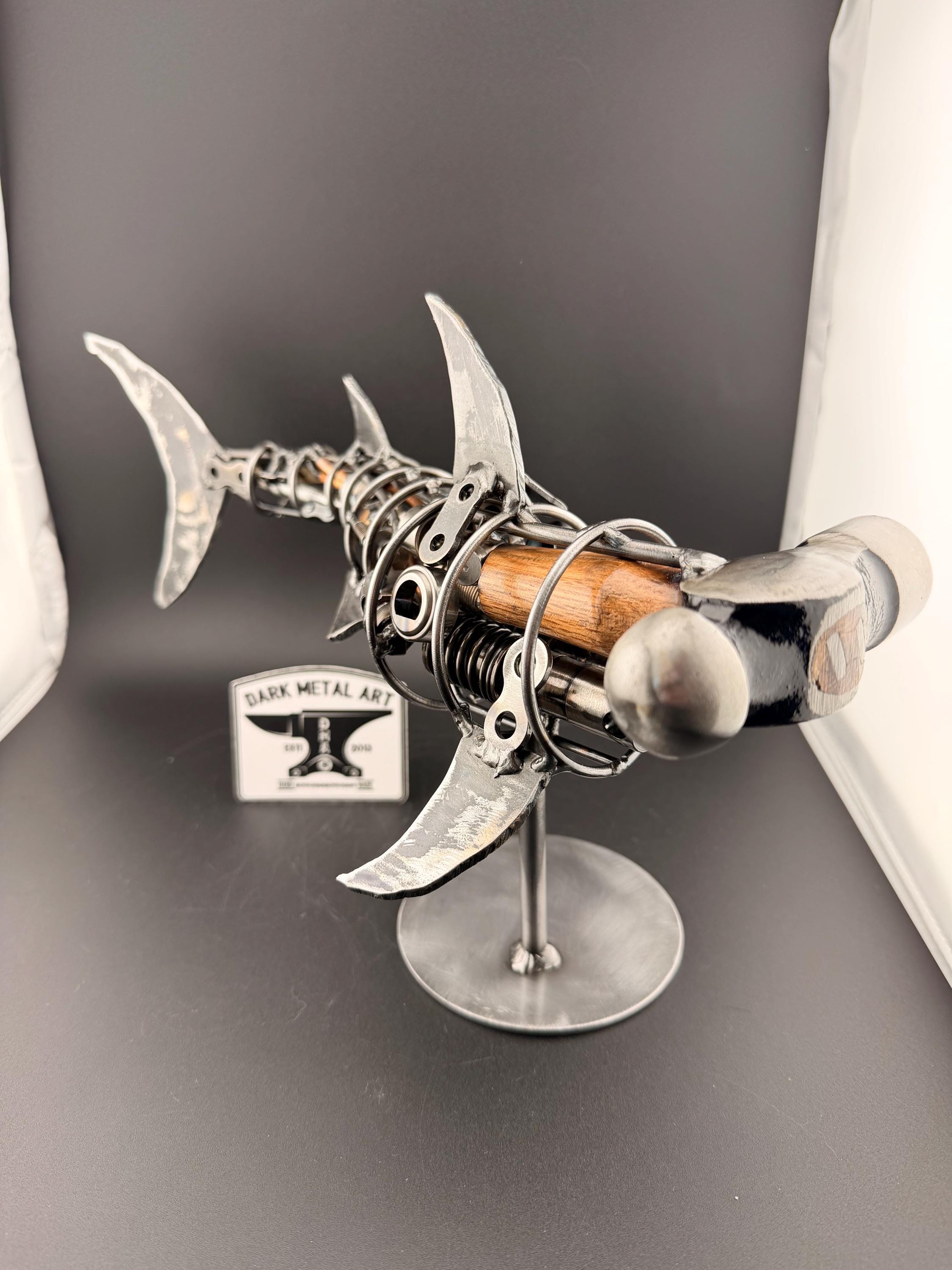 This Hammerhead Shark is made from scrap metal from Hendricks Motorsports, 4 Piston Racing and other performance/racing businesses. Each build is made to order and will differ slightly. Build time is usually 2-3 weeks depending on order volume. The Hammerhead Shark is usually about 11 inches long.