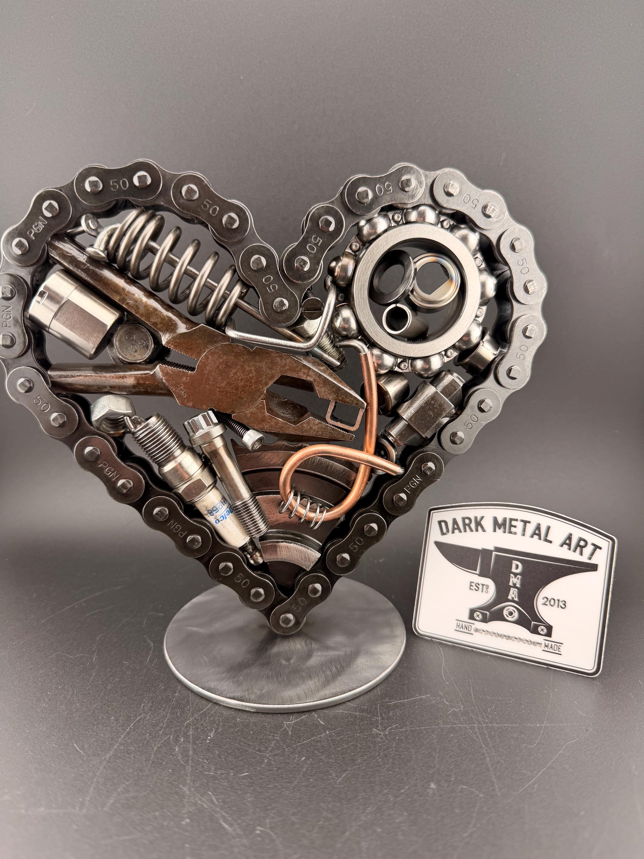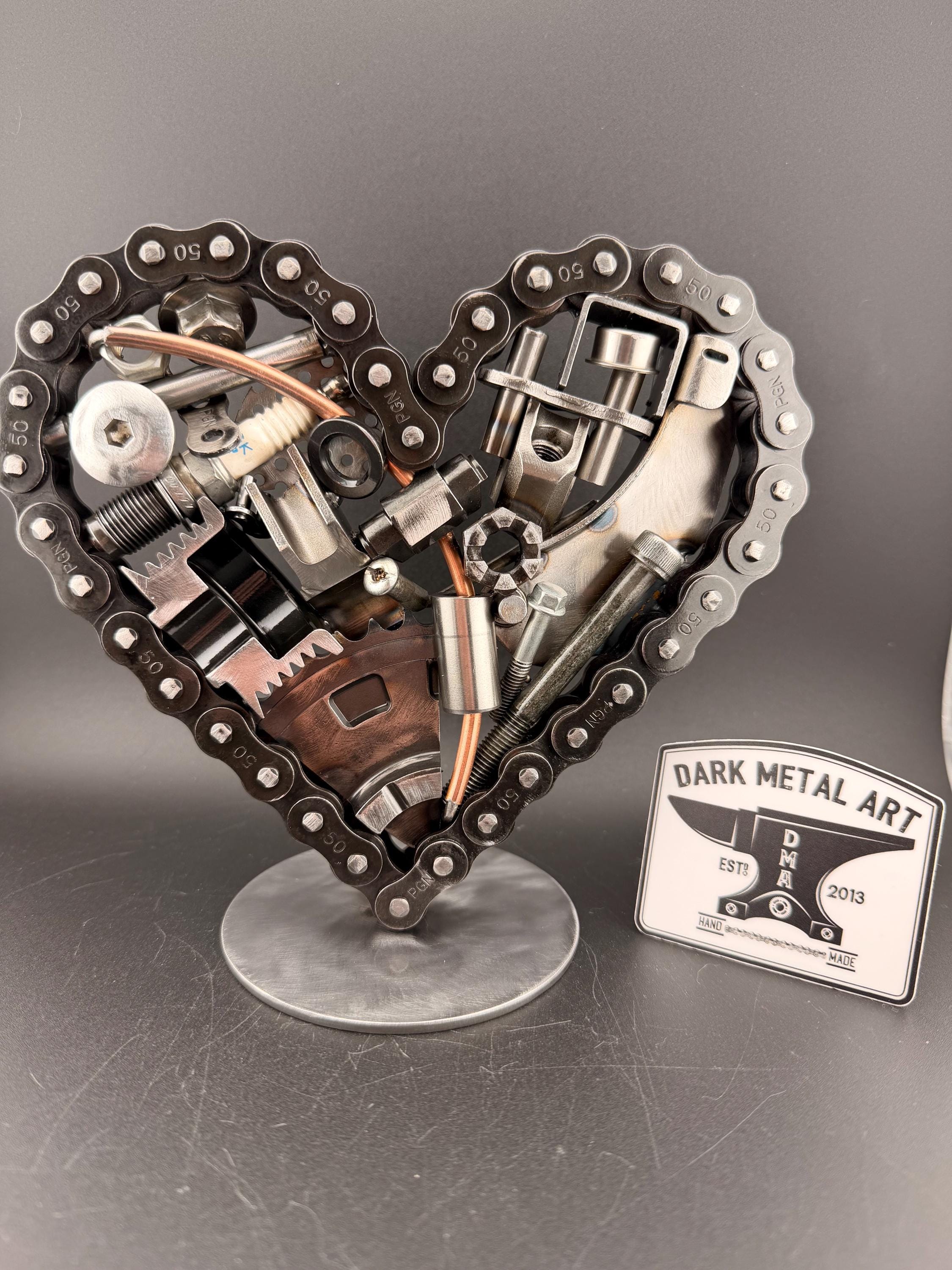 Spare parts are used to make Spare Hearts. Pieces that once made engines rev are reused to make these one of a kind builds. Show your Motor-head you love them with a hand built Spare Heart. This build is 7 inches tall and 7.5 inches wide.