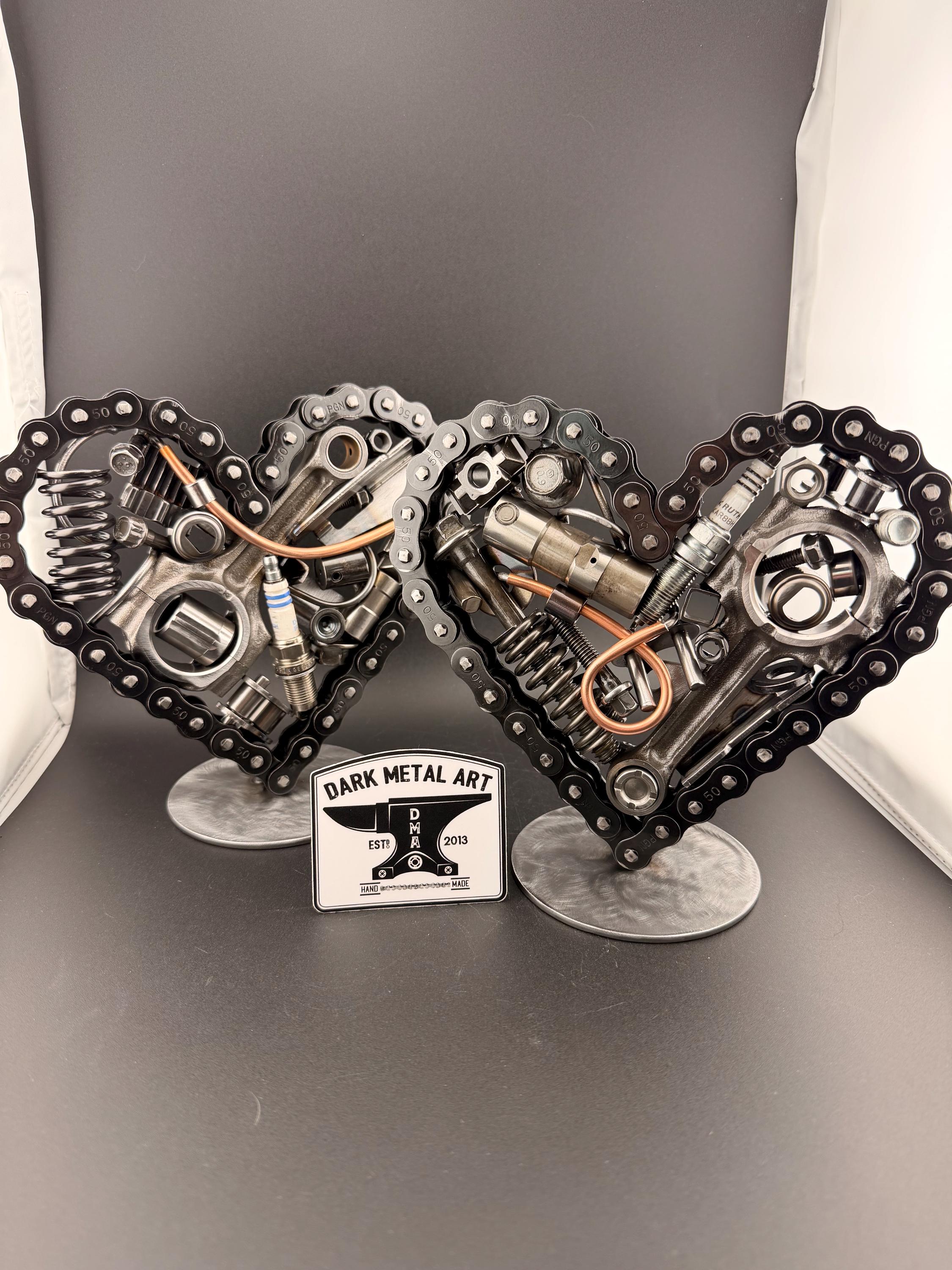 Spare parts are used to make Spare Hearts. Pieces that once made engines rev are reused to make these one of a kind builds. Show your Motor-head you love them with a hand built Spare Heart. This build is 7 inches tall and 7.5 inches wide.