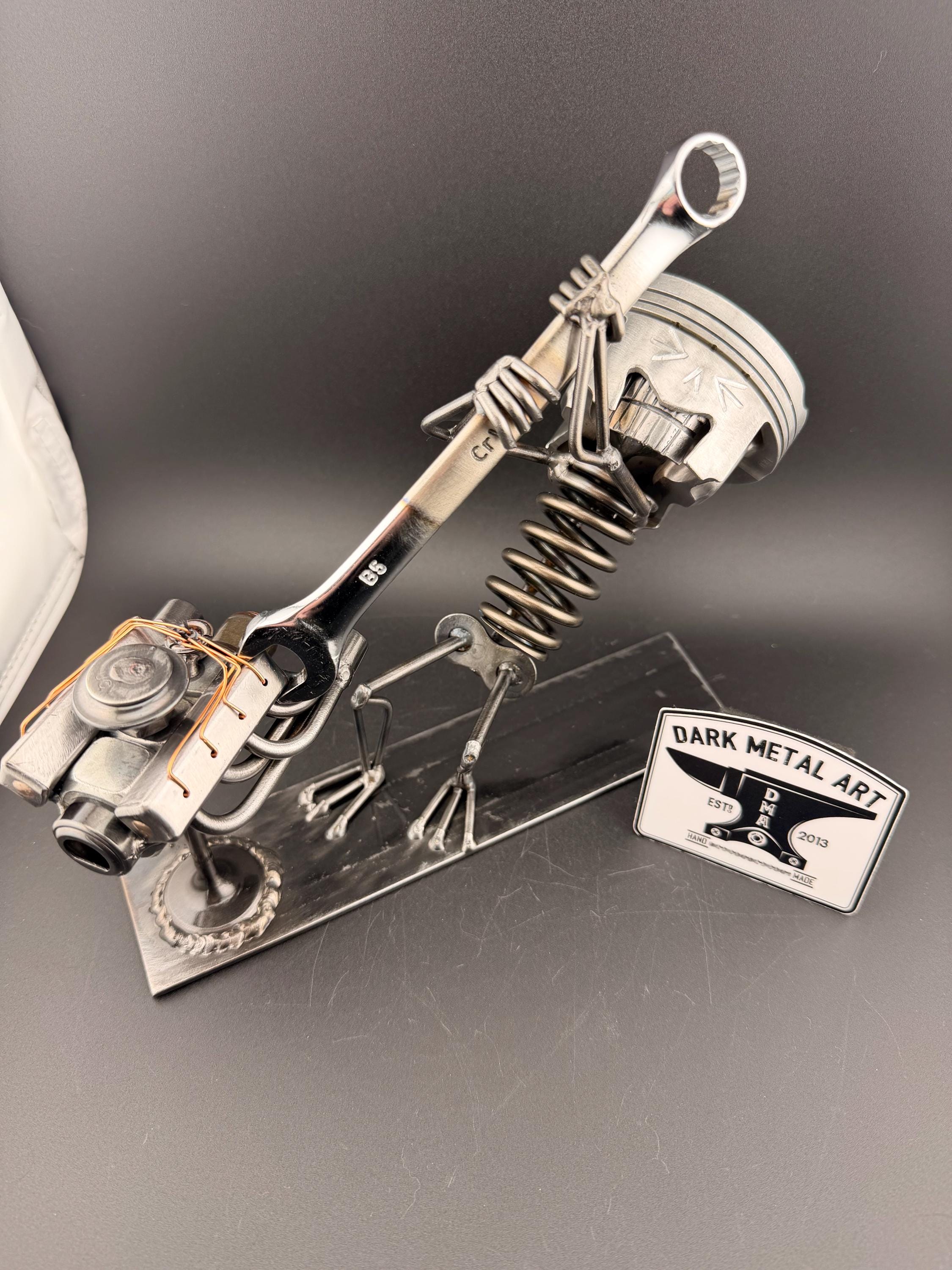 The Detailed Engine Mechanic is built from scrap metal from Mechanics. This is an excellent gift for the Mechanic or car guy you know! All builds are built to order and will vary slightly. Please allow 2-3 weeks for lead time (allow more time near holidays). This build is identical to the Metal Art Mechanic build except the engine has more detail with headers and spark plug wires. Those little details really add to the build!