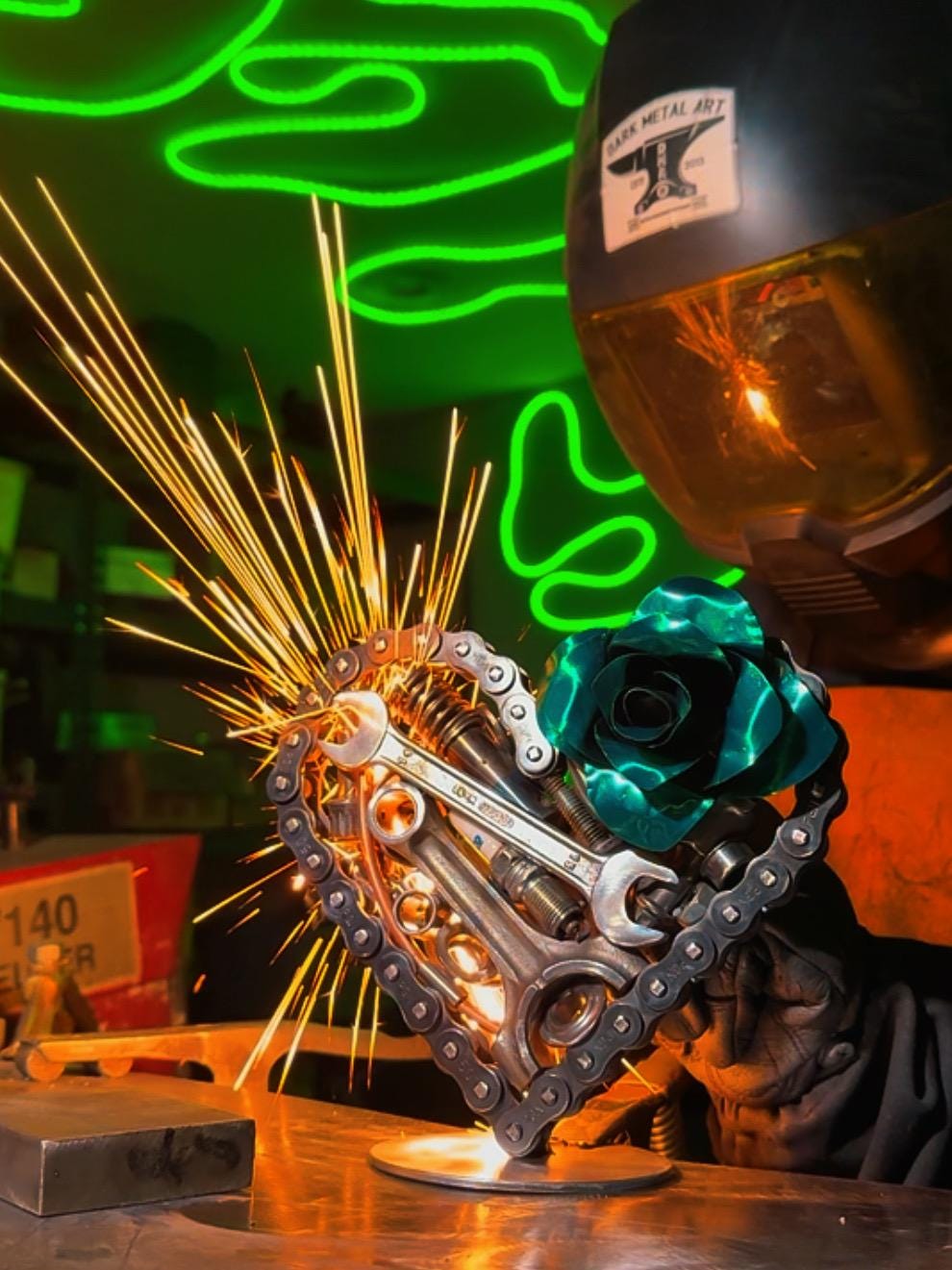 This sculpture is built from up-cycled metal and has a kick of red from a hand shaped Eternity Rose. Show that special someone how much they mean to you with this one of a kind build. No two builds are the same! These builds will come with a Red Rose unless another color is requested. I can build them with red, purple, electric blue, electric yellow, natural steel (silver) or blued steel (purple, blue, silver and gold hues). This build is 7 inches tall and 7.5 inches wide.